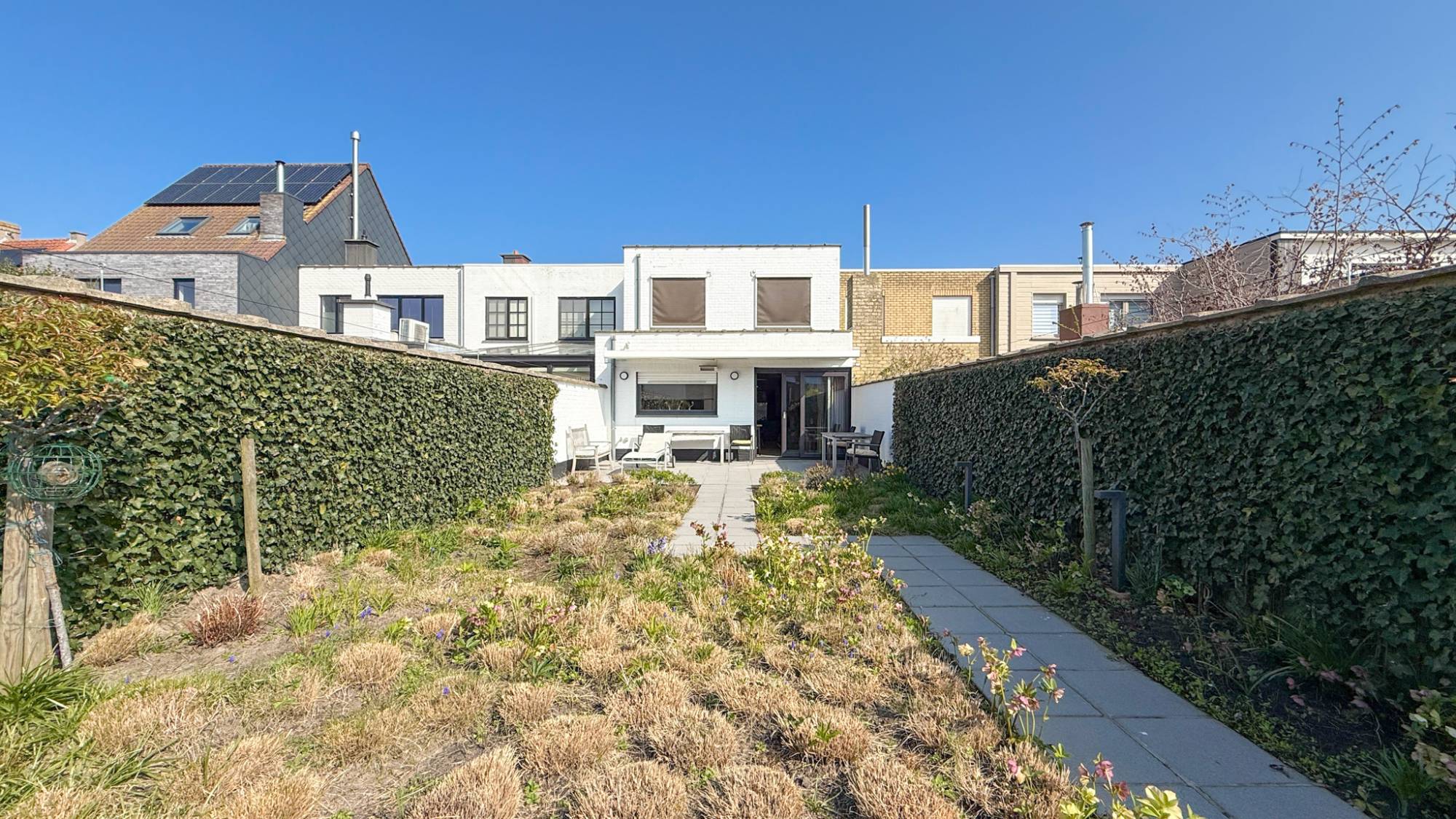 Vanuit de leefruimte heeft u directe toegang tot het zonnige terras en de verzorgde, aangelegde tuin met zonneluifel en tuinverlichting – ideaal om in alle rust te genieten. Achteraan bevindt zich een ruim tuinhuis.