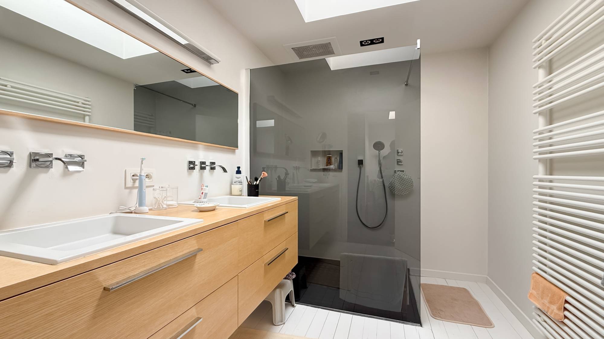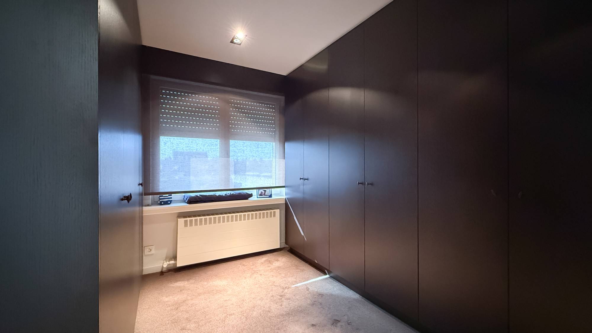 Eerste verdieping: De master bedroom wordt aangevuld met een tweede kamer ingericht als dressing met maatkasten. De lichtrijke badkamer, dankzij een lichtkoepel, beschikt over een dubbele lavabo en een ruime inloopdouche. Verder zijn er nog twee bijkomende kamers, waarvan één momenteel ingericht als bureau, evenals een praktische berging.