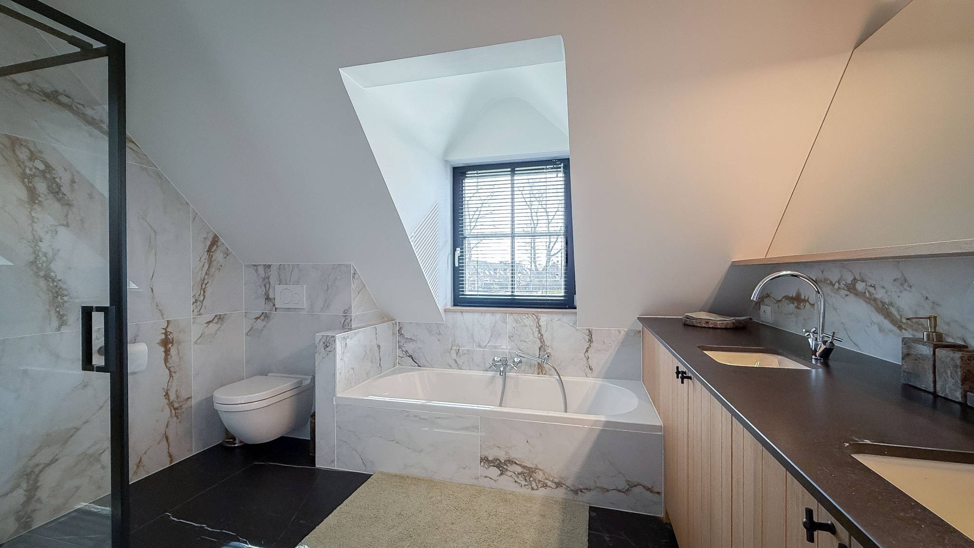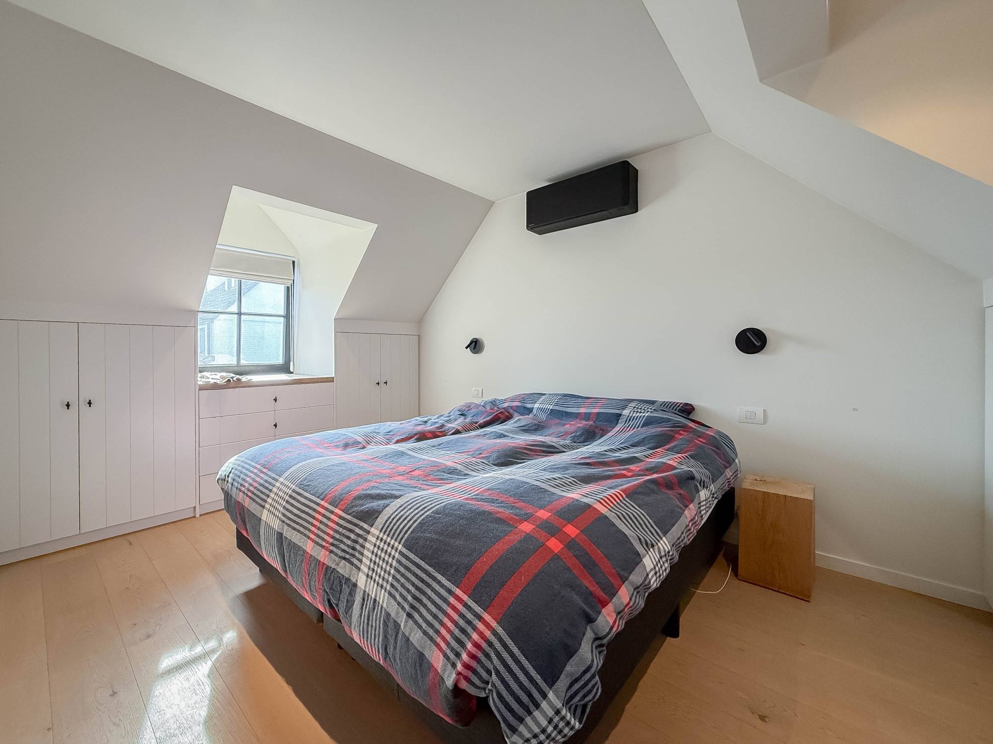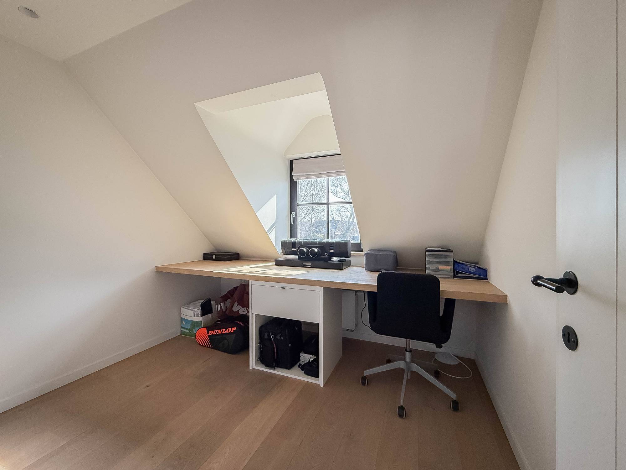 Op de bovenverdieping bevinden zich vier ruime slaapkamers, waarvan één momenteel als bureel is ingericht. De luxueuze badkamer biedt optimaal comfort met een ligbad, ruime inloopdouche, dubbele lavabo en toilet.